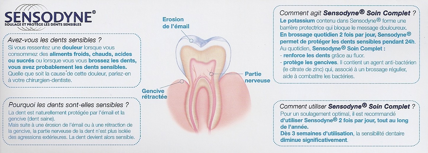 Aqua, Sorbitol, Hydrated Silica, Potassium Nitrate, Glycerin, Sodium Lauryl Sulfate, Aroma, Xanthan Gum, Titanium Dioxyde, Sodium Fluoride, Sodium Saccharin, Sodium Hydroxide, Limonene.
